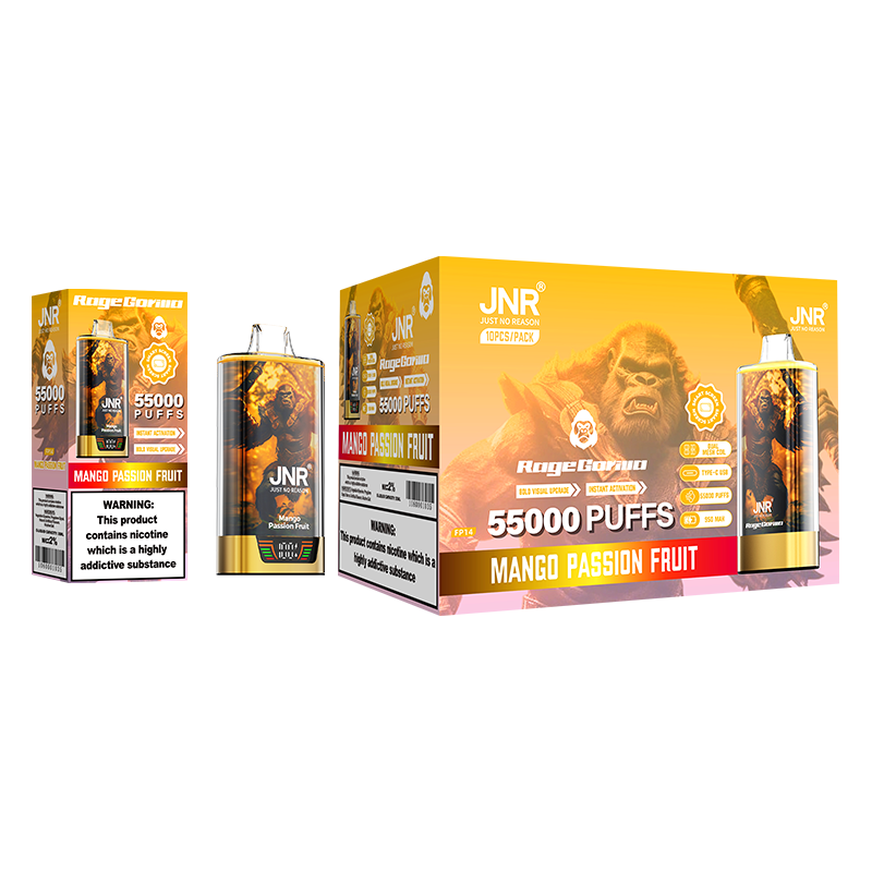 Die JNR Rage Gorilla 55000 Mango Passion Fruit vereint tropische Mango mit exotischer Passionsfrucht. 55.000 Züge karibischer Genuss dank 42 ml E-Liquid und Dual Mesh Coil. 950mAh wiederaufladbarer Akku mit Type-C, Smart Display. 2% Nikotin. Sofort einsatzbereit!