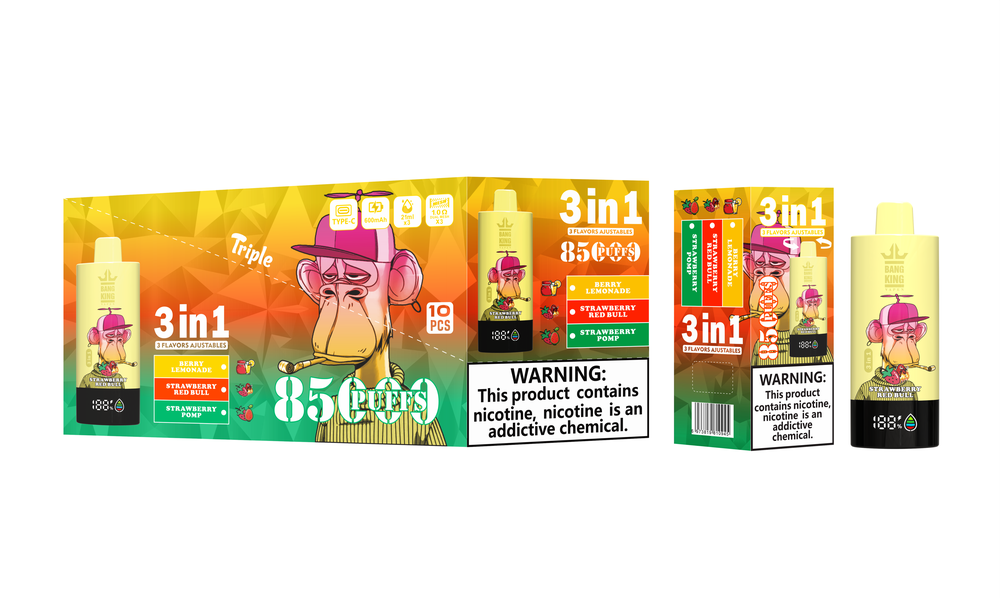 Die Bang King Triple 85000 mit Berry Lemonade/Strawberry Red Bull/Strawberry Pomp kombiniert drei erdbeerlastige Geschmacksrichtungen mit unterschiedlichem Charakter. Diese leistungsstarke Einweg-Vape liefert 85.000 Züge und bietet drei separate Aromen: spritziges Berry Lemonade, energiegeladenes Strawberry Red Bull und fruchtiges Strawberry Pomp.