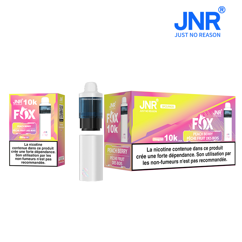 Die JNR FOX 10000 Peach Berry kombiniert saftige Pfirsiche mit fruchtigen Beeren. TPD-zertifiziert mit 10.000 Zügen, 2ml Pod, 10ml Nachfüllflasche, 800mAh Akku, Type-C Schnellladung und Mesh-Coil. 2% Nikotinsalz für milden Throat Hit. Perfekt für den professionellen Handel in Europa!