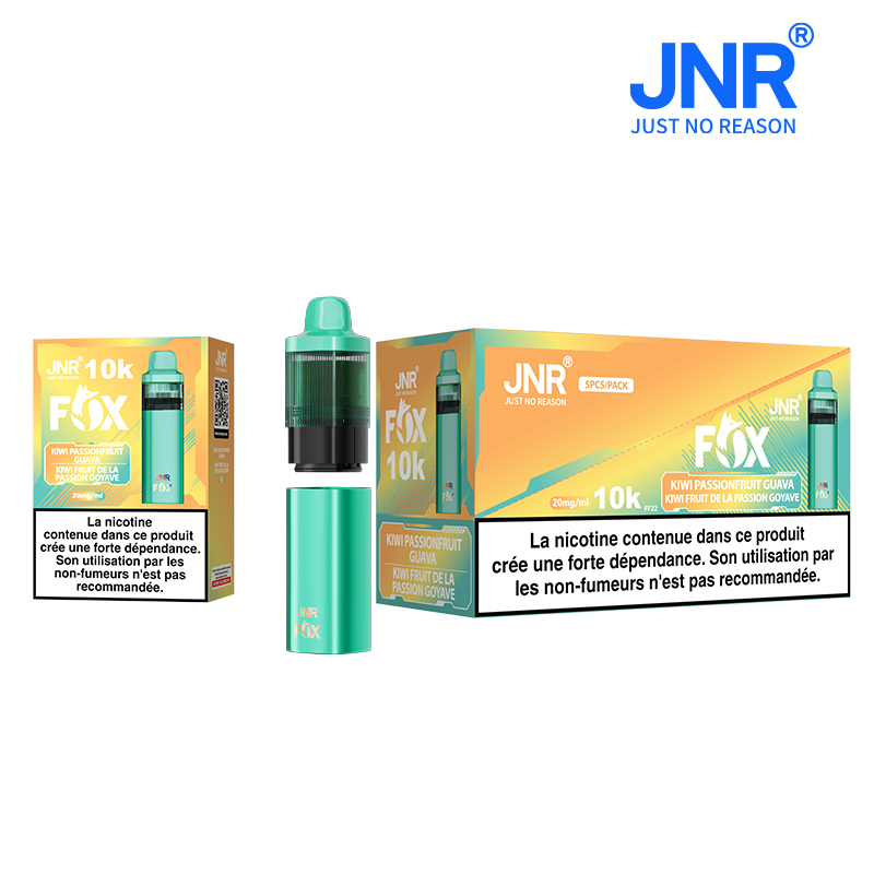 Die JNR FOX 10000 Puffs Pod Kit in der exotischen Variante Kiwi Passionfruit Guava ist eine TPD-geprüfte, wiederaufladbare Vape mit Nachfüllsystem. Komplett mit 2-ml-Fertig-Pod, 10-ml-Refill-Flasche und Type-C-Schnellladung – perfekt für den Großhandelsmarkt in Europa.